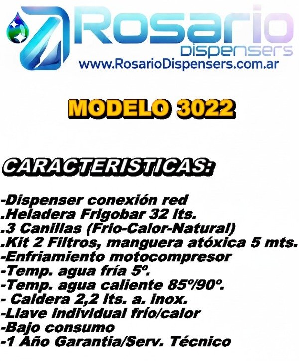 Dispenser de agua Modelo: 3022 - Conexión a Red - 3 Canillas - Con Heladera Frigobar